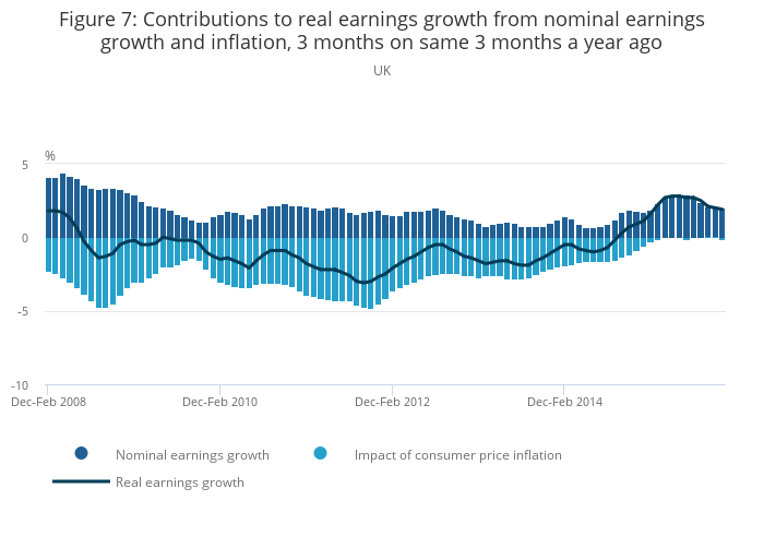 Figure 7: Contributions to real earnings growth from nominal earnings growth and inflation, 3 months on same 3 months a year ago