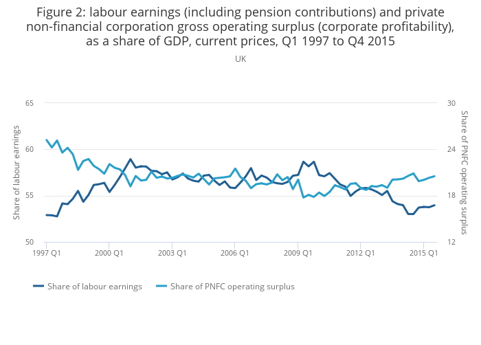 Figure 2: labour earnings (including pension contributions) and private non-financial corporation gross operating surplus (corporate profitability), as a share of GDP, current prices, Q1 1997 to Q4 2015