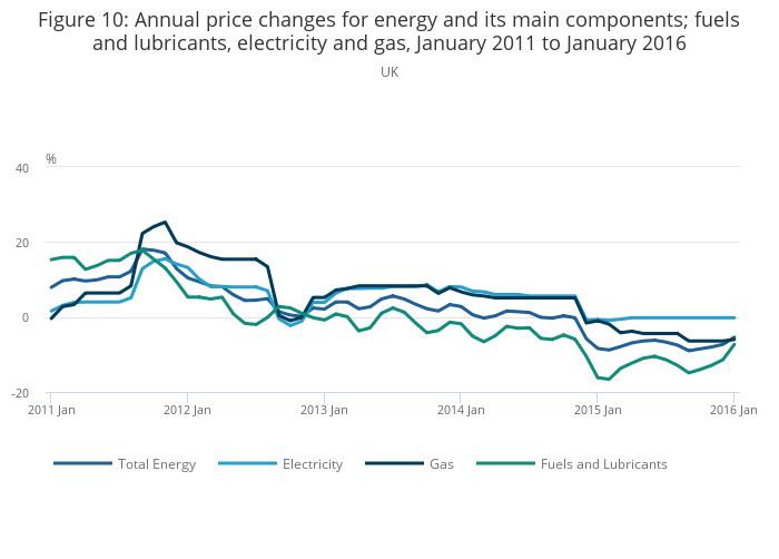 Figure 10: Annual price changes for energy and its main components; fuels and lubricants, electricity and gas, January 2011 to January 2016