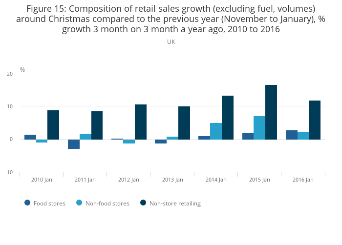 Image .csv .xlsThe improvement in retail sales, excluding fuel, around the Christmas period in recent years has been accompanied by strong growth in non-store retailing, as Figure 15 shows. The stronger growth of non-store retailing, which includes online and mail order retail, may reflect the nature of this component and the changing spending pattern of consumers. However, non-store retailing makes up a much smaller proportion of the range of retail businesses covered by the Retail Sales Index compared to predominantly food and non-food stores. Consequently, the improvement in retail sales growth in the November to January period was driven by growth in store-based retail sales, rather than non-store retailing despite its much stronger growth.