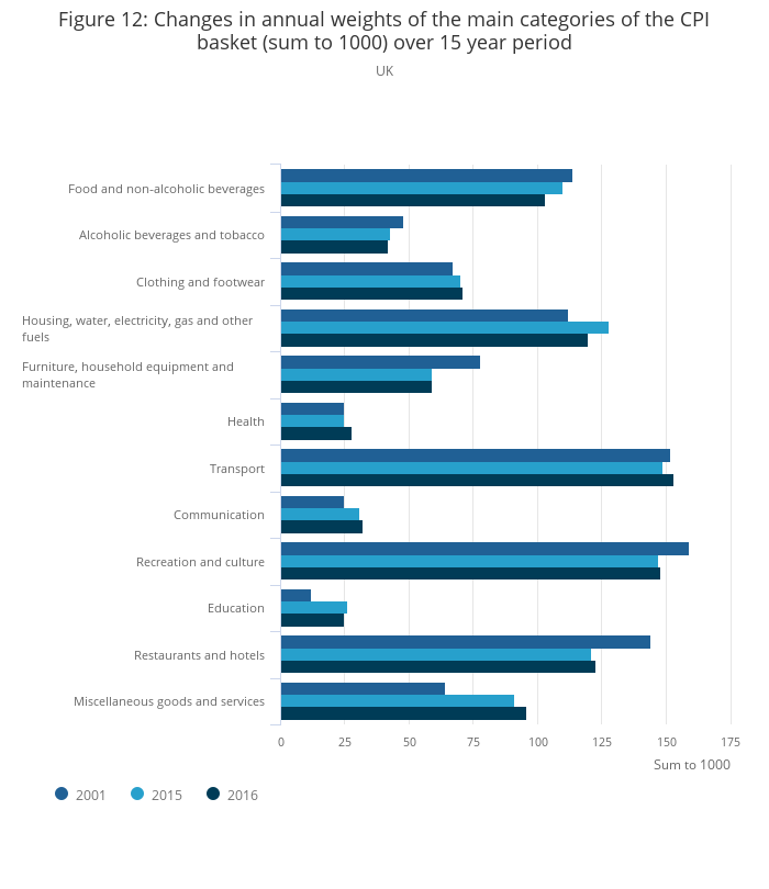 Download this chart Figure 12: Changes in annual weights of the main categories of the CPI basket (sum to 1000) over 15 year period