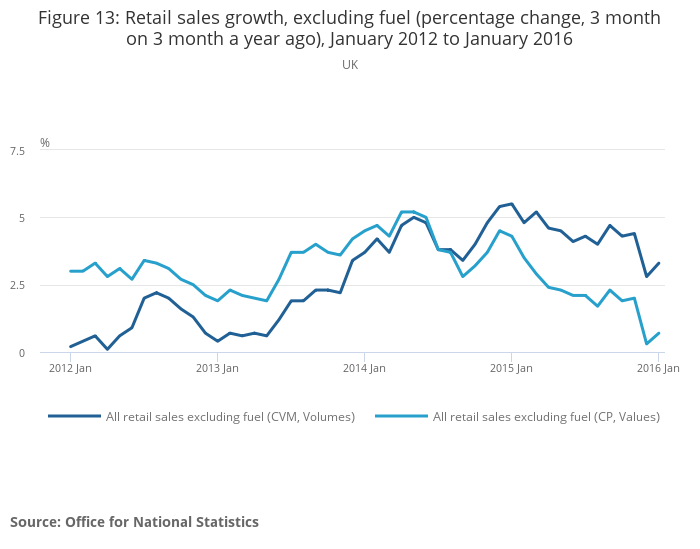 Download this chart Figure 13: Retail sales growth, excluding fuel (percentage change, 3 month on 3 month a year ago), January 2012 to January 2016
