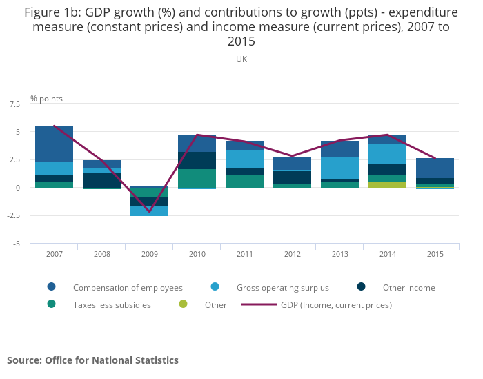 Figure 1b: GDP growth (%) and contributions to growth (ppts) - expenditure measure (constant prices) and income measure (current prices), 2007 to 2015