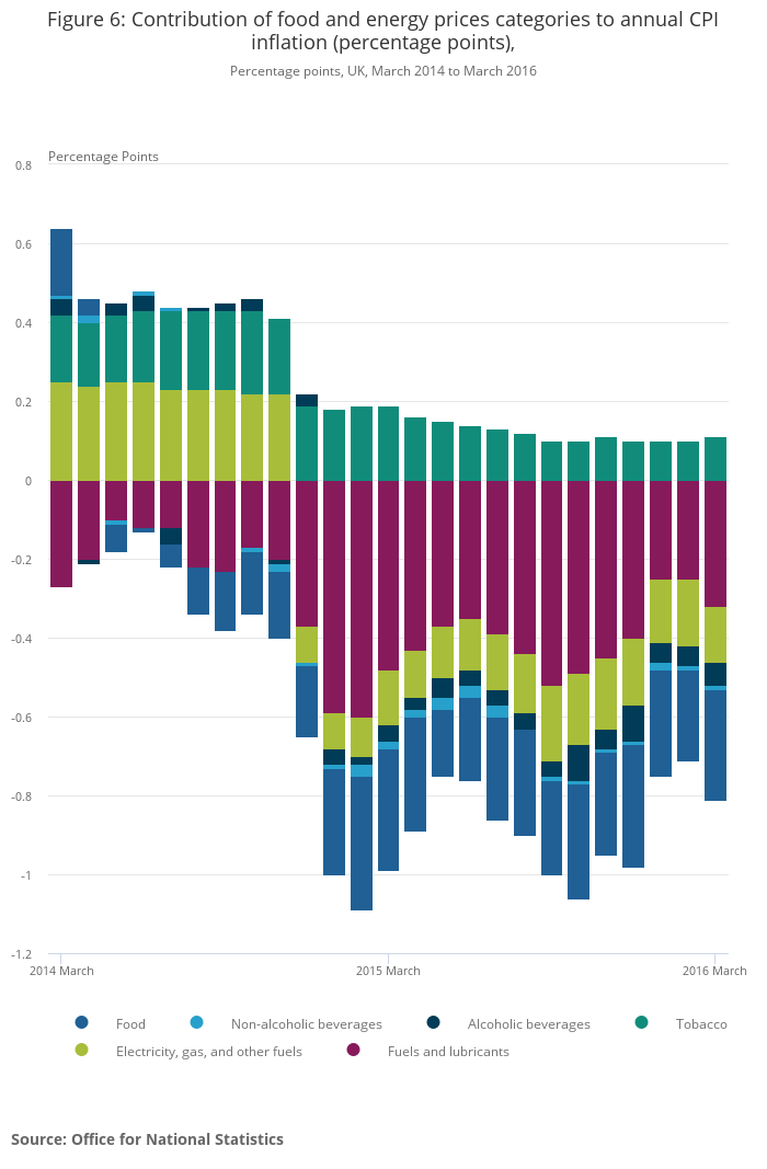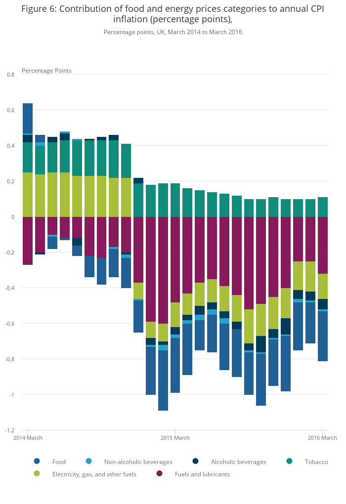 Image .csv .xlsThe sharp decline in oil prices during 2014 and 2015 has been a significant factor weighing down on headline CPI inflation, and has been an important element of the expanding gap between headline and core inflation. Brent crude, the UK’s primary oil type, fell by 72% from $112 a barrel in June 2014 to $31 a barrel in January 2016. Fuels and lubricants, the main CPI component incorporating oil prices, has contributed negatively to inflation consistently over the past two years (Figure 6). However, this downward pressure increased sharply at the start of 2015, with the negative contribution peaking at 0.6 percentage points in January and February 2015. The fall in oil prices was also reflected in the downward contribution from electricity, gas and other fuels, which sharply increased in late 2014 and has persisted since. In addition, food has also made a persistent negative contribution since late 2014, and in March 2016 stood at -0.3 percentage points. Contributions from the beverages categories (both alcoholic and non-alcoholic) have contributed the least to headline inflation (positively or negatively) during the last two years with both posting small negative contributions in March 2016. Tobacco is the only ‘non-core’ CPI category to have had an upwards contribution throughout and this has been consistently between 0.1 and 0.2 percentage points.