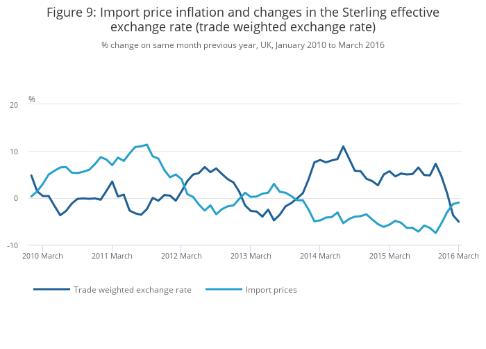 Figure 9: Import price inflation and changes in the Sterling effective exchange rate (trade weighted exchange rate)
