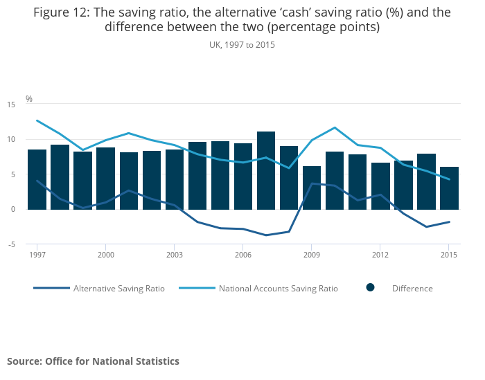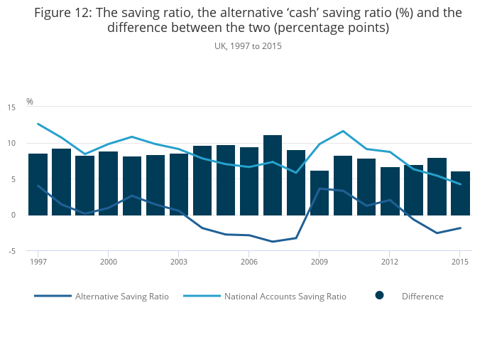 Download this chart Figure 12: The saving ratio, the alternative ‘cash’ saving ratio (%) and the difference between the two (percentage points)