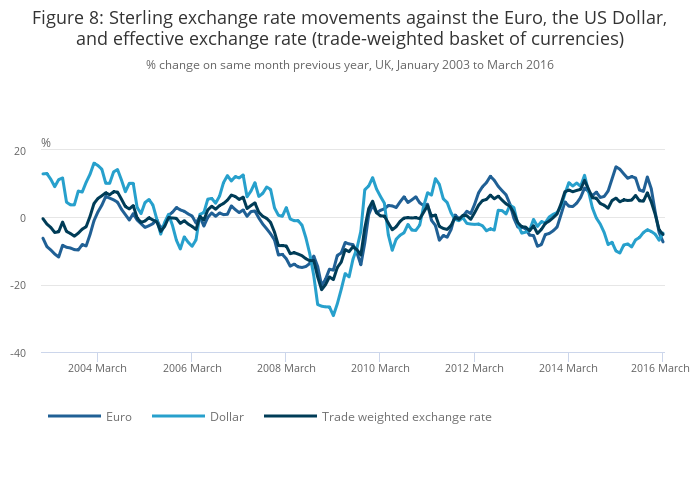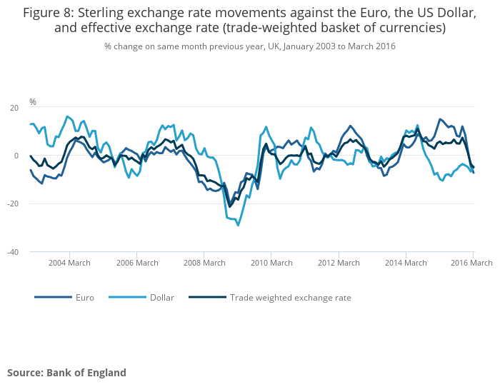 Download this chart Figure 8: Sterling exchange rate movements against the Euro, the US Dollar, and effective exchange rate (trade-weighted basket of currencies)