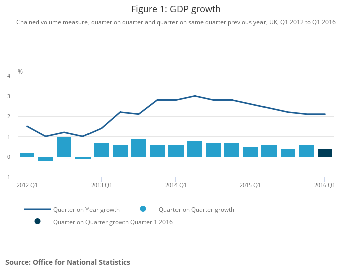 The preliminary GDP release indicated that the UK economy grew by 0.4% in the first quarter of 2016, slightly slower than during the previous quarter (0.6%), and below the quarterly average of the past three years (0.6%) when GDP growth became more established. The economy grew more steadily from the first quarter of 2013 compared to the earlier years between the economic downturn and 2013, but growth in the first quarter of 2016 marked a slight moderation in that trend.
