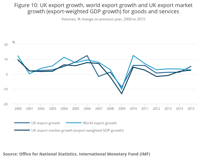 - World export growth is sourced from the IMF WEO, April 2016. UK export market growth is based on ONS estimates of country shares of total exports multiplied by GDP growth in the relevant country based on IMF GDP growth data.