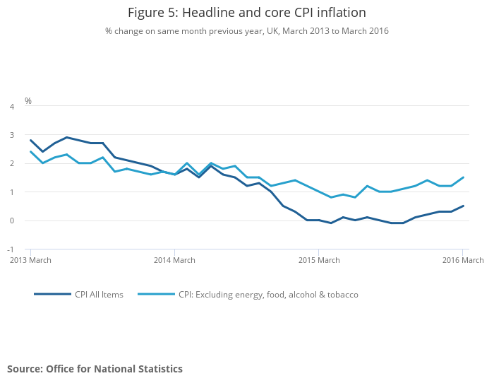 The Consumer Price Index (CPI) 12-month rate steadily declined between June 2013 and April 2015, reaching a low of -0.1% in April, September and October 2015. The inflation rate began to rise in November 2015 and by March 2016 it had reached 0.5% – an increase of 0.2 percentage points compared with the February 2016 rate – and the highest rate since December 2014. Inflation is nevertheless still below the Bank of England’s target of 2%, which is set by the Treasury. Inflation has been below 2% since January 2014.
