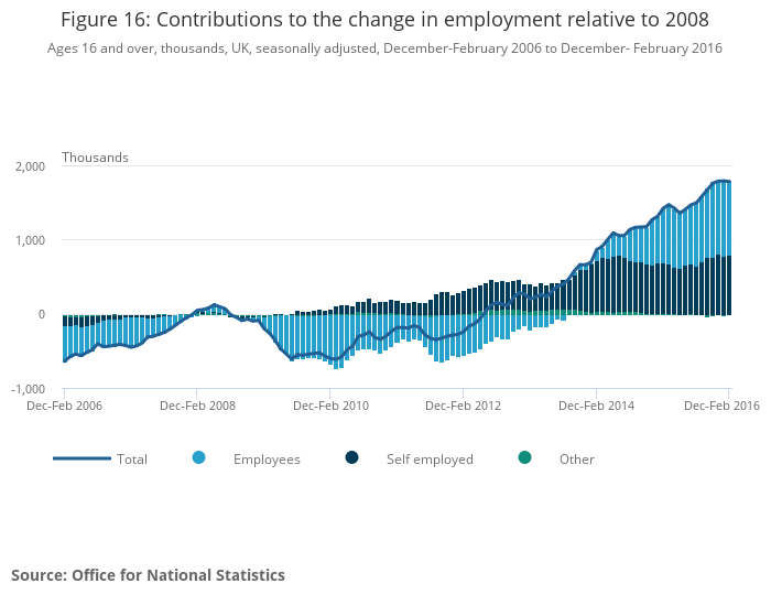 .png (27.1 kB) .xlsx (30.0 kB)The increase in the employment rate since 2013 – resulting in a record high of 74.1% for 16 to 64 year olds in the three months to February 2016 – reflects differing experiences for men and women. These experiences are explored in Figure 15, which shows contributions to the change in the male and female 16 and over employment rate, relative to 2008. While rates fell during the economic downturn in 2008-09, primarily driven by a fall in full-time work for both, the rate fell by more for men than for women. In both cases the contribution from involuntary part-time workers (those who could not find full-time work) rose. “Part-time: Other”, which includes all voluntary part-time workers, contributed to a fall in the female and male employment rate relative to 2008 – part of a long-term trend toward full-time work for women.