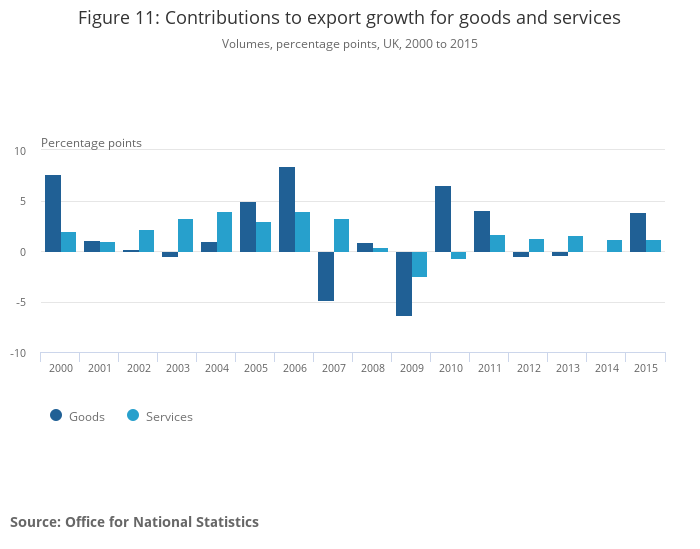 UK export growth performed relatively well during 2015, compared with world export growth and the performance of the UK’s export markets. This improvement in export growth during 2015 was due to a larger pick-up in export growth for goods rather than for services. However, the contribution to export growth from services has been more consistently positive in recent years, while goods export growth has tended to be more erratic.