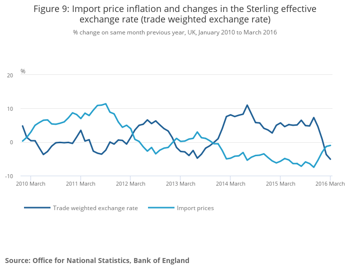Currency movements directly affect both the prices faced by consumers, and the prices paid by businesses for imported goods and raw materials. The Producer Price Index (PPI) – a measure of manufacturing firms’ input and output prices – showed that both input and output price inflation declined during late 2014 and most of 2015, following a period of appreciation between mid-2013 and mid-2014, but have recovered in recent months. However, overall both input and output prices are still falling compared with a year earlier. In March 2016, input price inflation stood at -6.5% and output price inflation at -0.9%. The path of output and input PPI suggests that during recent years input costs have been feeding through to the output prices of manufactured goods, although labour costs are typically a much larger share of manufacturers’ output prices compared to input costs.