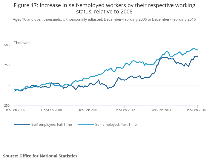 Image .csv .xlsFigure 17 splits the growth in self-employment into those that work full-time or part-time. It shows that relative to the 2008, increases in self-employment have been concentrated among the part-time self-employed – 416,000 of the 710,000 increase in self employed workers between 2008 and 2015 were part-time. While part-time self employment has increased steadily since 2006, growth in full-time self employment was concentrated toward the end of 2013. This strong increase in self-employment reflects a marked structural shift in the UK’s labour market. The ONS will publish an article in June to indentify the drivers of these changes in self-employment.