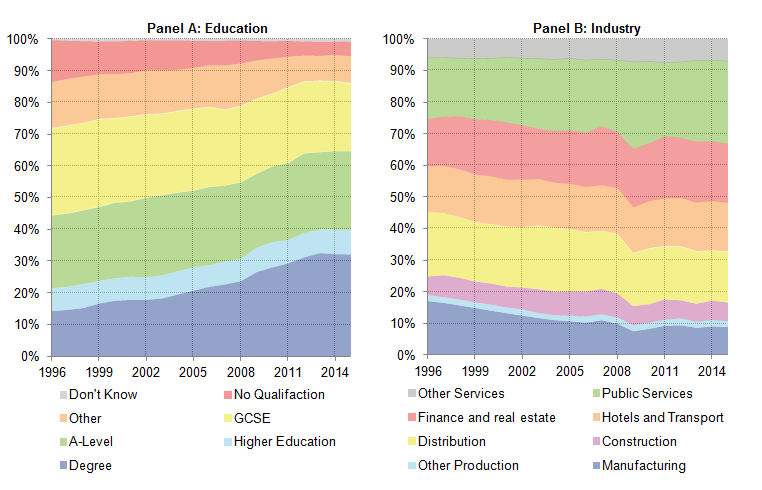 .png (28.3 kB) .xls (42.5 kB)While average new starter earnings growth may signal changes in the degree of spare capacity in the economy, it is also likely to reflect the changing composition of this group. For example, if new starters in a given period are relatively highly (poorly) skilled, then the average earnings of this group are likely to be higher (lower) to reflect this. Changes in the composition of new starters between periods can therefore result in changes in the growth of average new starter earnings, absent any changes in recruitment difficulties. Figure 19 shows two of these compositional changes, examining how the educational attainment and industry of employment of new starters has varied since 1996. Panel A suggests that the proportion of new starters who have a university education has increased over much of this period, rising from 14% in 1996 to 32% in 2013, but stalling thereafter. As more highly educated workers tend to earn more on average, the growing share of new starters with university degrees is likely to have supported average new starter earnings growth over this period. Equally, the slowdown in the share of new starters who are highly educated since 2013 may help to explain the recent slower earnings growth.