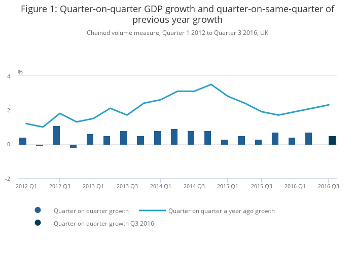 The economy as a whole has grown by an estimated 0.5% in Quarter 3 (July to September) 2016. Although this is a slightly slower growth rate than the previous quarter, GDP has continued the trend of positive growth seen since 2015.