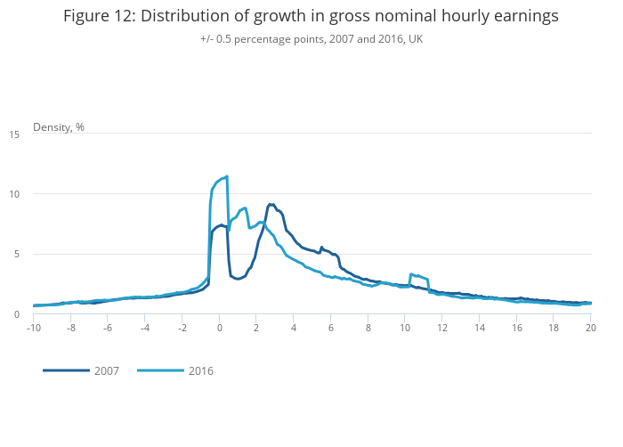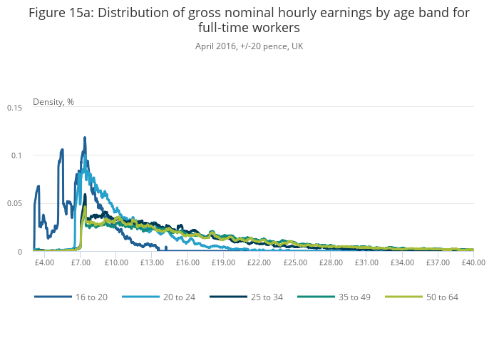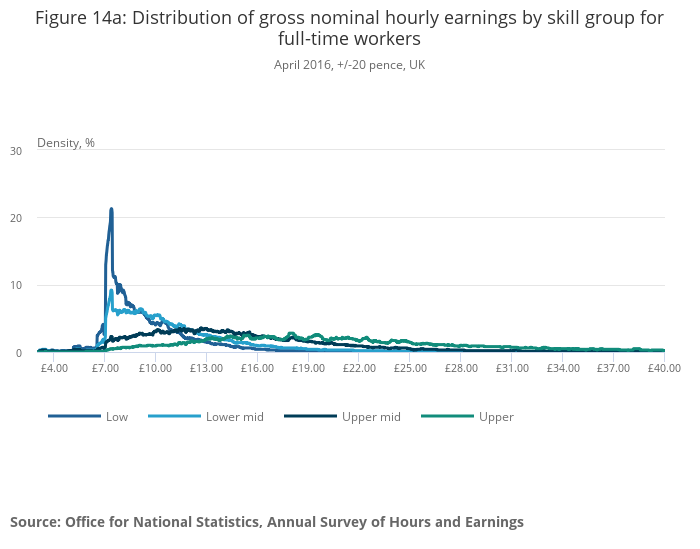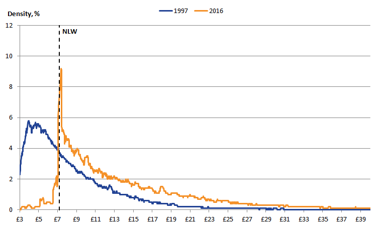 In 2016, there was a continuation of the trend for a growing concentration of pay at the bottom of the UK’s earnings distribution, clustered around the new National Living Wage (NLW) of £7.20 per hour, which is required to be paid for those employees who are 25 years and older.