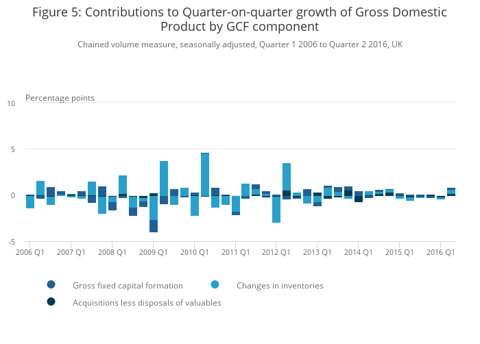 .png (27.8 kB) .xls (71.7 kB)Figure 5 shows the contributions to quarter-on-quarter growth of GDP by component of GCF. The quarter-on-quarter contribution shows how particularly between 2007 Quarter 4 (Oct to Dec) and 2012 Quarter 3 (July to Sept) changes in inventories were both volatile and influential.
