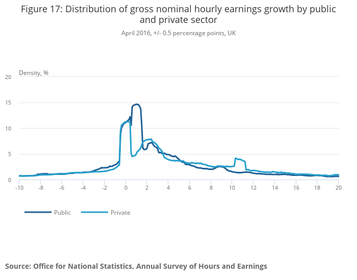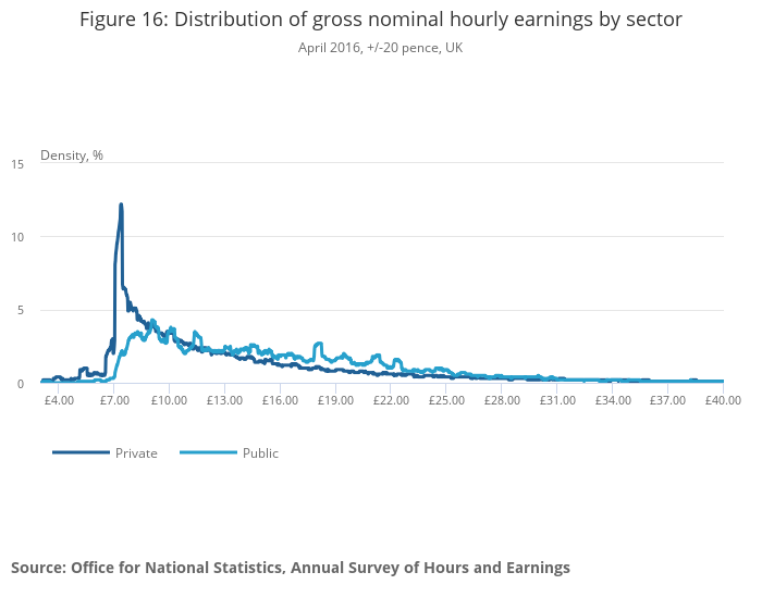 There is less evidence of a concentration at earnings around the new National Living Wage in the public sector compared to the private sector as workers are generally paid above this level in the public sector.