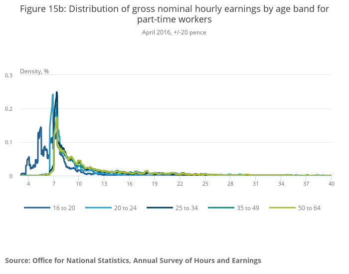 Around 10% of full-time 16- to 24-year-olds and 15% of part-time 16- to 24-year-olds appear to be getting paid at around the £7.20 NLW in April 2016, although they are not legally required to be paid this rate.
