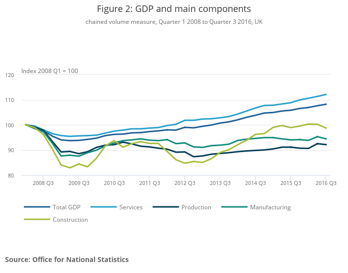 Figure 1 shows that the economy as a whole has grown an estimated 0.5% in Quarter 3 (July to September) 2016. Although this is a slightly slower growth rate than the previous quarter, GDP has continued the trend of positive growth seen since 2015.