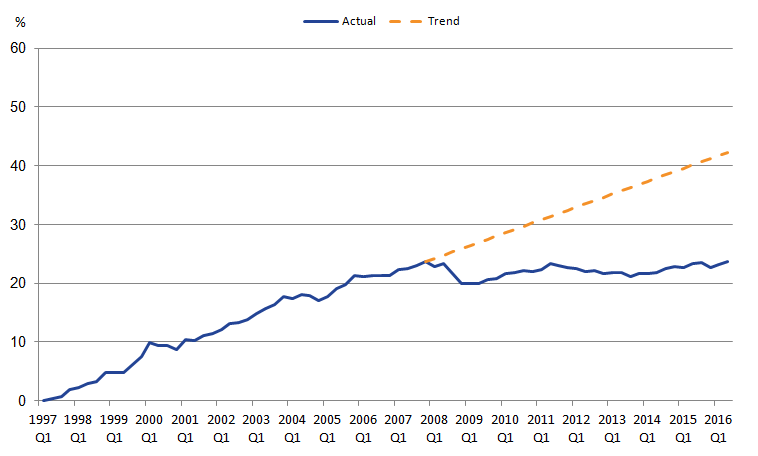 .png (11.0 kB) .xls (26.6 kB)The trend line shows how output per hour would have performed had it continued to grow at the Quarter 1 1997 -Quarter (Oct to Dec) 4 2007 rate (taking a compound average growth rate). The darker blue line represents the change in productivity shown in the latest data - so for example, output per hour was 23.8% higher in 2016 Quarter 2 2016 compared with Quarter 1 1997, but remains roughly the same level as in Quarter 4 2007.