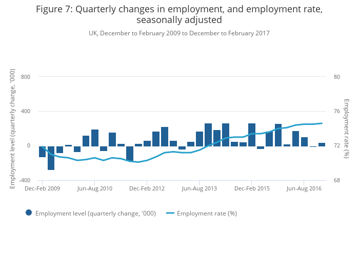 Headline labour market indicators show 39,000 more people in work in the 3 months to February 2017, driving the employment rate to 74.6%. As shown in Figure 7, the overall employment rate has been increasing since 2011.