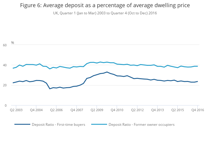 Since 2010, the deposit ratio for both first-time buyers and former owner-occupiers has been decreasing steadily. By Quarter 4 (Oct to Dec) 2016, the deposit ratio has returned to around the same level seen in mid-2008. In particular, first-time buyers have seen a decrease in the average deposit paid, from £61,000 in Quarter 1 2010 to £50,000 by the end of 2016.