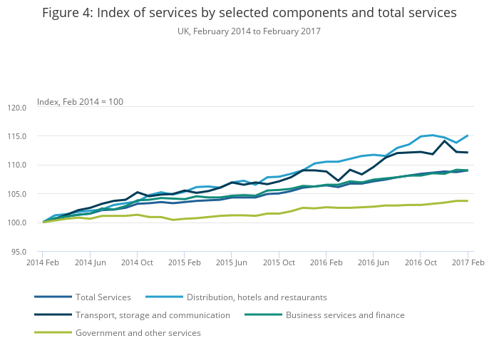 Following a monthly fall of 0.1% in January 2017, February saw a 0.2% increase in total services output. In the most recent 3 months to February, services output rose by 0.5% compared with the 3 months to November 2016. However, this 3-month on 3-month figure has slowed in each consecutive month since the 1.0% growth recorded in October 2016.