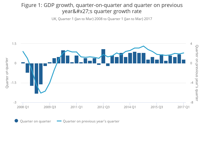 - The preliminary estimate of gross domestic product (GDP) suggests that the economy grew by 0.3% in Quarter 1 (Jan to Mar) 2017 compared with growth of 0.7% in Quarter 4 (Oct to Dec) 2016.