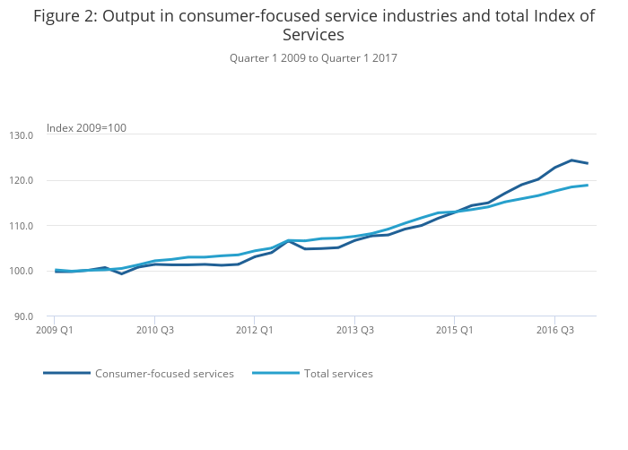 Figure 2 shows an index of output in consumer-focused service industries compared with the total index of services. Up until this quarter, growth in consumer-focused services had been consistently outpacing that of total services since early 2015. In 2016, consumer-focused services contributed 0.8 percentage points of the 2.5% annual output GVA growth (a disproportionately large contribution given their weight of around 12.6% of GDP).