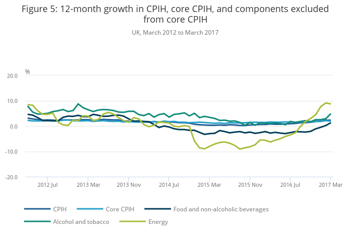 Image .csv .xlsBoth the headline CPIH and core CPIH 12-month rates have increased gradually since November 2015. For headline CPIH, this has been largely driven by the energy component, primarily from fuels and lubricants. More recently, prices of food and non-alcoholic beverages have also started to rise following nearly 3 years of deflation.