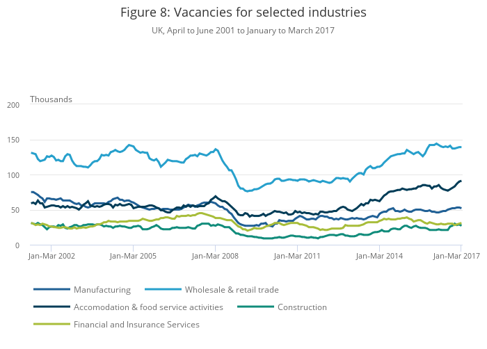 The number of vacancies reached 767,000, up 14,000 from the same period a year ago. Similarly, the number of unemployed people per vacancy declined to 2.0 in the 3 months to February 2017. By industry, accommodation and food service activities (up 8,000) was the largest contributor to the increase in vacancies in the quarter, as shown in Figure 8.
