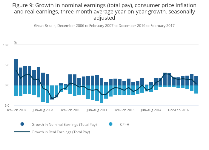 Figure 9 shows rates of seasonally-adjusted nominal and real wage growth since 2007, using 3-month averages compared with the previous year. Average weekly earnings, including bonuses, grew by 2.3% in the 3-month period to February 2017 compared with a year earlier. Wages have been adjusted for inflation using the consumer price inflation including owner occupiers’ housing costs (CPIH). Once adjusted for inflation, in this analysis, average weekly earnings increased by 0.3% including bonuses compared with a year earlier. Estimates of growth in total real pay (including bonuses), in this analysis, differ slightly from the published estimates in Analysis of real earnings: Apr 2017 due to a different method of implementing the seasonal adjustment.