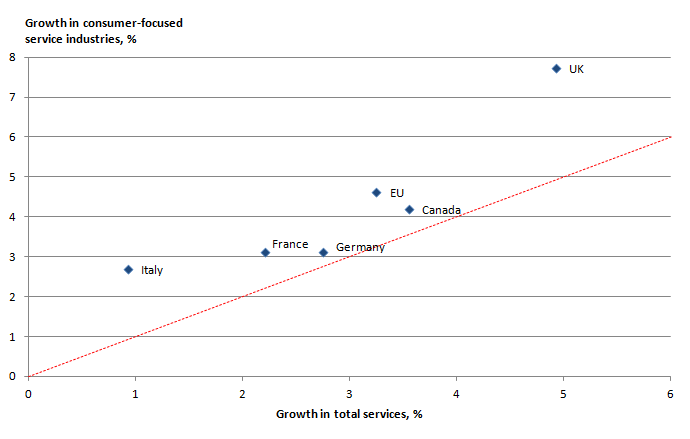 Download this image Figure 3: Growth in total services and consumer-focused service industries, by country