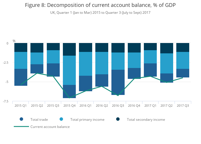 Nôl i'r tabl cynnwys9. The UK’s current account deficit narrows to 4.5% of GDP in Quarter 3 (July to Sept) 2017