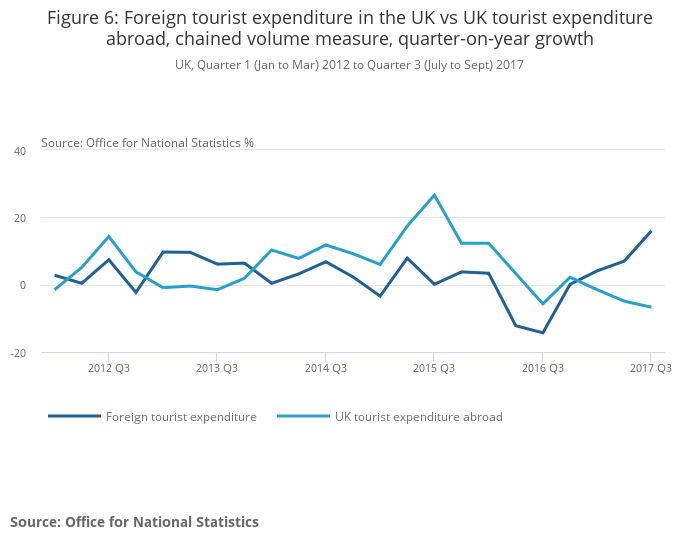 Today’s new data also show that foreign tourist expenditure in the UK (in volume terms) continued to strengthen, increasing by 16.0% in the year to Quarter 3 2017 – the highest quarter-on-year growth since Quarter 2 2010 (Figure 6). Meanwhile UK tourist expenditure abroad continued its downward trend, falling by 6.7% in the year to Quarter 3 2017. These movements in net tourism have coincided with the recent sterling depreciation, which has seen the sterling exchange rate index (ERI) fall by 17.5% since Quarter 3 2015.