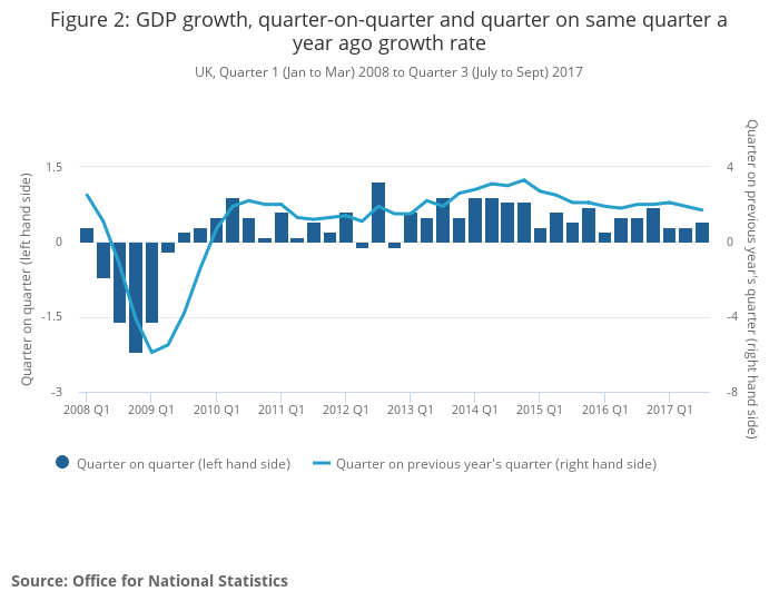 - The UK economy grew by 0.4 per cent in Quarter 3 (July to Sept) 2017, unrevised from the second estimate of GDP