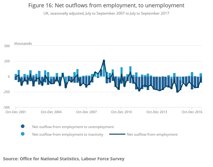 Image .csv .xlsHowever, during the latest available period, the net outflow from employment increased considerably, (by 137,000), compared with the previous quarter. This was partly due to a net outflow from employment to inactivity (of 54,000), which increased by 60,000 and turned positive in the three months to September 2017 from negative (6,000), in the three months to June 2017. During the latest available period, the net outflow from employment to unemployment increased by 77,000 (to a negative 99,000) compared with the previous quarter. It should be noted that the average net outflow between 2010 and 2017 from employment to unemployment was negative (164,000). This implies that a rise in net outflow from employment to unemployment during the latest available quarter was the main driver of the overall increase in the net outflow from employment.