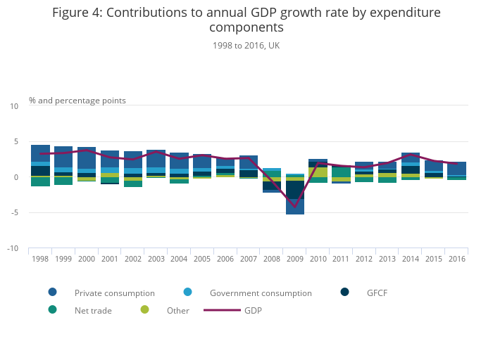 Image .csv .xlsFigure 4 also shows that the contributions to GDP growth from gross fixed capital formation (GFCF) have declined over the last 3 years, from 1.1 percentage points in 2014 to 0.1 percentage points in 2016. In addition, net trade went from making no contribution (to 1 decimal place) in 2015, to a contribution of negative 0.4 percentage points in 2016.