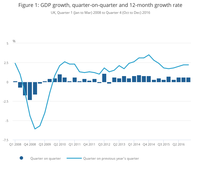 Nôl i'r tabl cynnwys4. The preliminary estimate of GDP shows that the UK economy continued to grow by 0.6% in Quarter 4 2016, the same rate as the previous 2 quarters