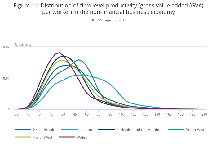 In addition, experimental analysis shows there is also quite a wide variation in productivity levels within regions. Figure 11 plots the distribution of firm-level productivity for some of the NUTS1 regions of Great Britain2, illustrating how plant-level output per employee varied in 2014. For example, the distribution of firm-level productivity in London is skewed towards higher productivity levels compared with the distribution of firm productivity levels in other regions. The median firm-level gross value added (GVA) per worker in London is 36% above the average for Great Britain in 2014. This compares with Wales, which has the lowest firm-level median GVA per worker at 28% below the Great Britain average.