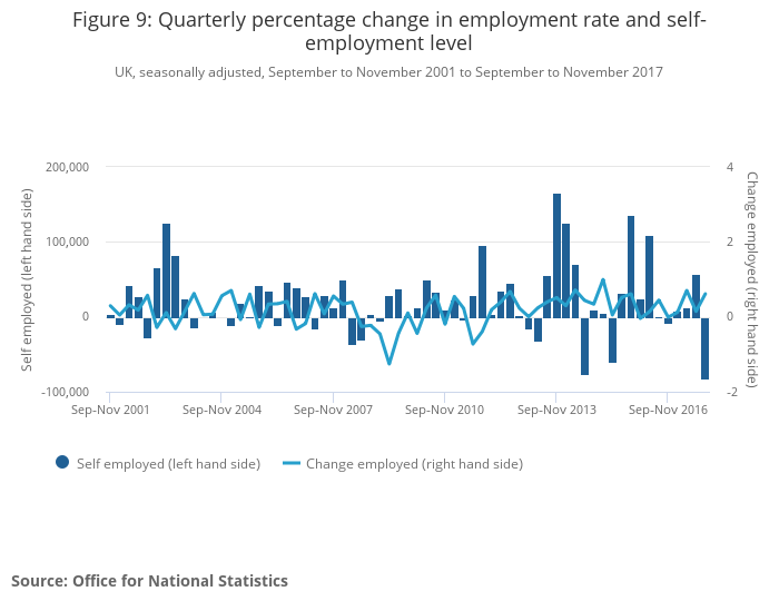 Image .csv .xlsWhile employment is at a record-high level, the total number of self-employed workers decreased by 82,000 in the three months to November 2017. As a result, the number of people in self-employment is 4,000 lower compared with the same time a year earlier. Overall, 2017 has seen a change in the longer-term trend of increasing self-employment.