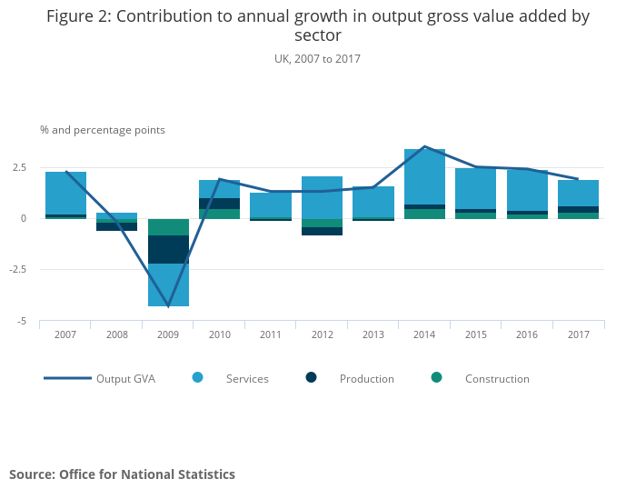 The preliminary estimate of GDP shows that the UK economy grew by 0.5% in Quarter 4 2017, the strongest quarterly growth rate in 2017 (Figure 1). This was driven by solid expansions in both production and services output (both up by 0.6%), while the construction industry continued its decline with a third consecutive quarterly fall in output (down by 1.0%).