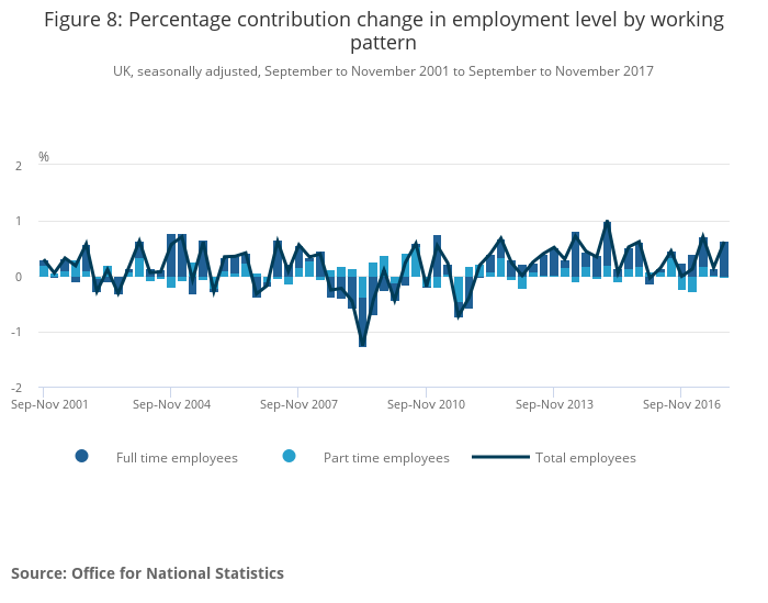 The increase in the number of people in work was driven by a rise in full-time employees, whose number increased by 173,000 in the three months to November 2017 when compared with the previous quarter, to a record high of 20.25 million people. In contrast with the overall growth, the number of employees working part time fell by 7,000 during the same period.
