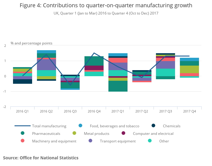 On a sub-sector level, the production of metal products and pharmaceuticals accounted for over half of total manufacturing growth in Quarter 4 2017, contributing 0.5 and 0.3 percentage points respectively (Figure 4). Quarter 4 2017 growth in metal products (4.6%) was the strongest quarterly growth rate since Quarter 1 (Jan to Mar) 1998 and reflected increases in all components within metal products.