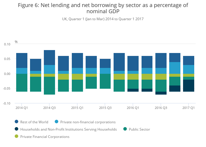 The fall in the household saving ratio is mirrored in the net lending and net borrowing data. Figure 6 shows the net lending and net borrowing position of the different sectors of the UK economy and highlights that in Quarter 1 2017, the household and non-profit institutions serving households (NPISH) sector continued to be a net borrower. In Quarter 1 2017, the public sector and financial corporations were also net borrowers, although public sector net borrowing as a share of nominal gross domestic product (GDP) has declined to its lowest since 2002.