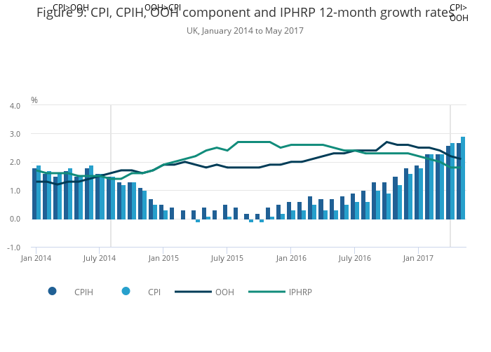 Figure 9 shows the 12-month growth rates for the Consumer Prices Index (CPI), Consumer Prices Index including owner-occupiers’ housing costs (CPIH), owner occupiers’ housing costs (OOH) and the Index for Private Housing Rental Prices (IPHRP) from January 2014 to May 2017. Over this period, CPI annual growth rates have been both above and below CPIH annual growth rates. The condition for the order of these growth rates is related to the relative growth rate for owner-occupiers’ housing costs compared with the rest of the CPI basket.