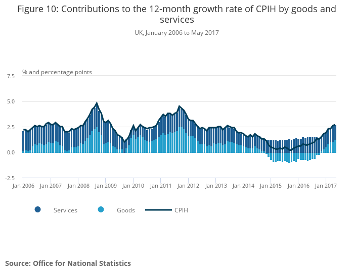 The contribution to CPIH from goods prices meanwhile has been more variable ranging from negative 1.0% to 2.5% and accounting for most of the volatility seen in the headline CPIH growth rate over the period.