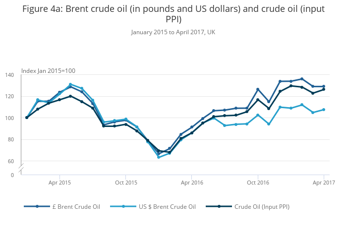 Figure 4b shows the relationship between the refined petroleum products component of producer output prices and the fuels and lubricants component of CPIH. These two components have tracked each other closely over the period since January 2015 and both have slowed since February 2017. This reflects the fall in Brent crude oil prices seen since February 2017, as well as the recent strengthening of sterling, with the slight increase in the dollar price of Brent crude oil in April 2017 not reflected in the sterling price. In April 2017, the 12-month growth rate for the fuels and lubricants component of CPIH was 11.5%, down from 17.1% in March 2017.